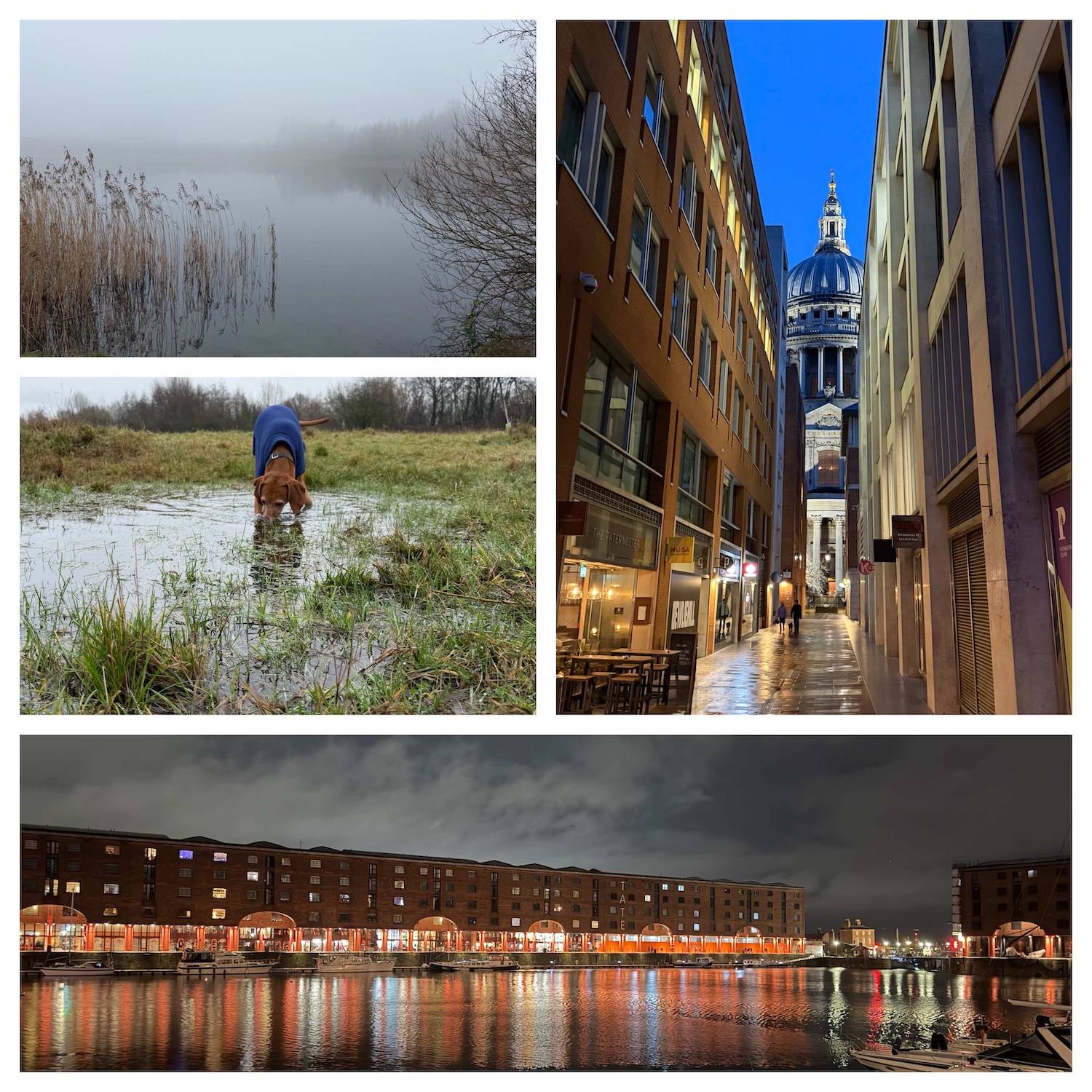 A few small moments from February, away from the screen. Mist and rain, Liverpool, and London again. (And Wally living his best life, puddle snorkelling).